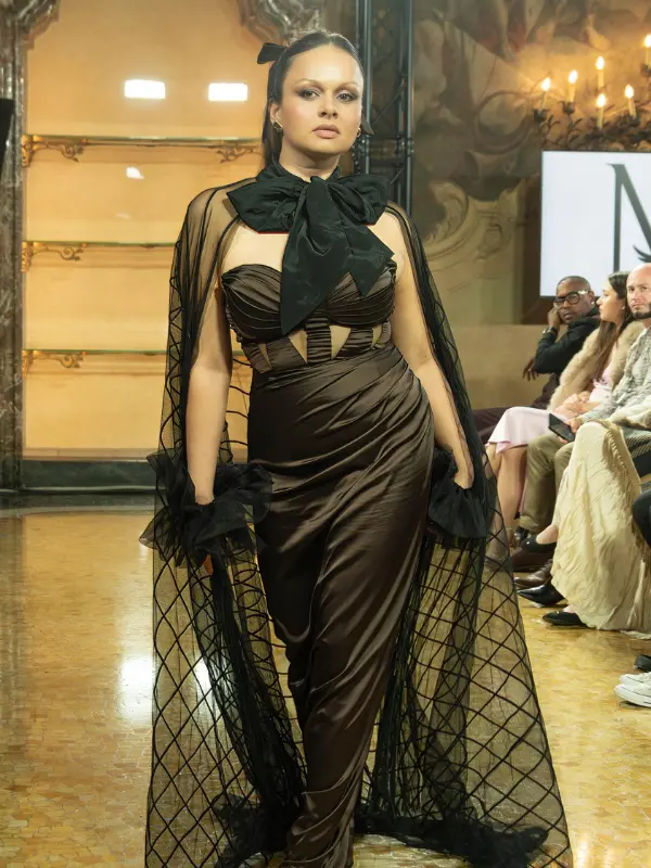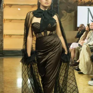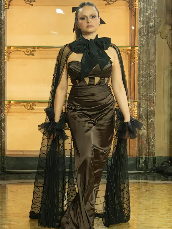The detachable mesh cape introduces a striking contrast lined with delicate linear textures and finished with an oversized, adjustable bow at the neckline.